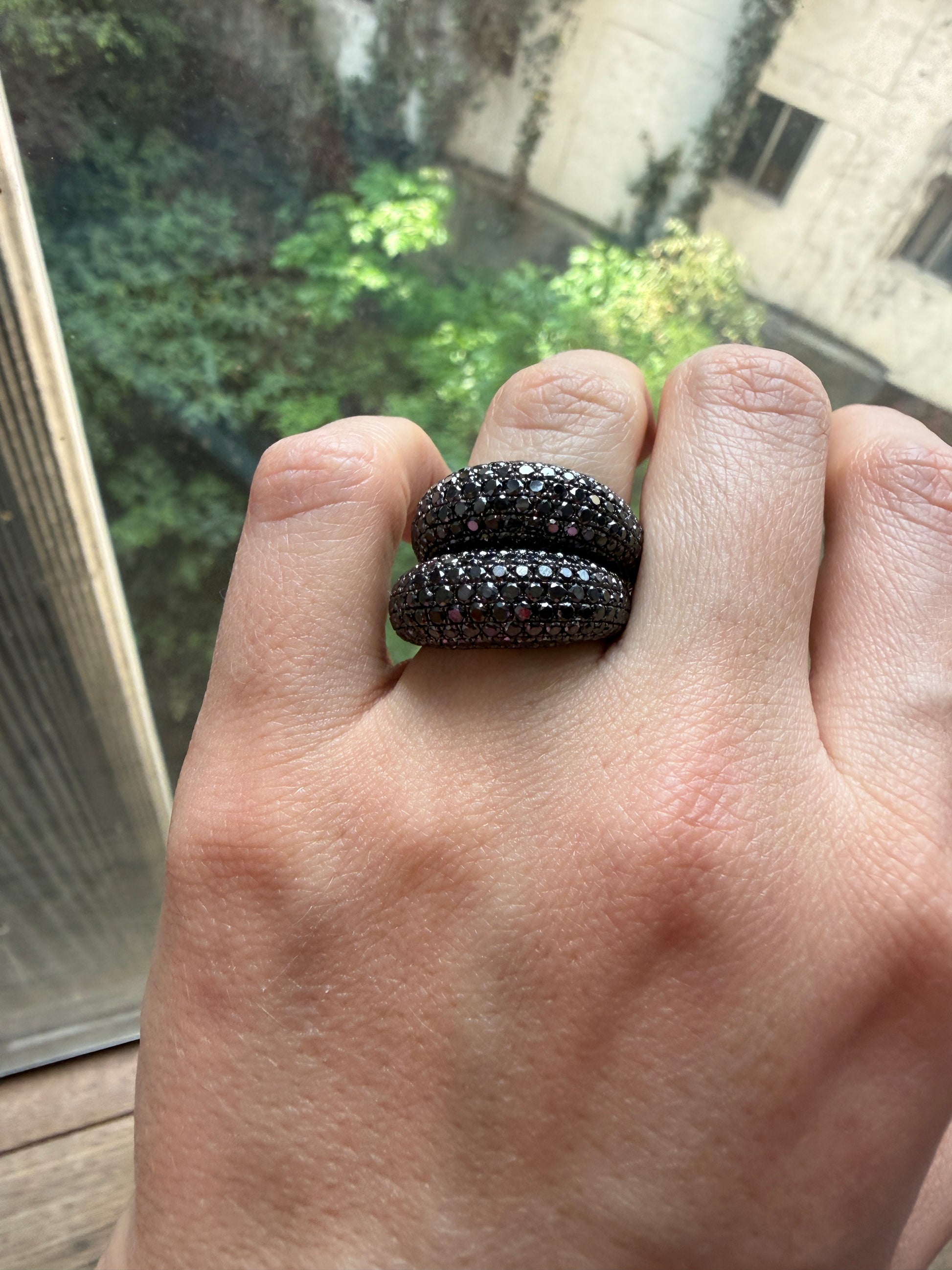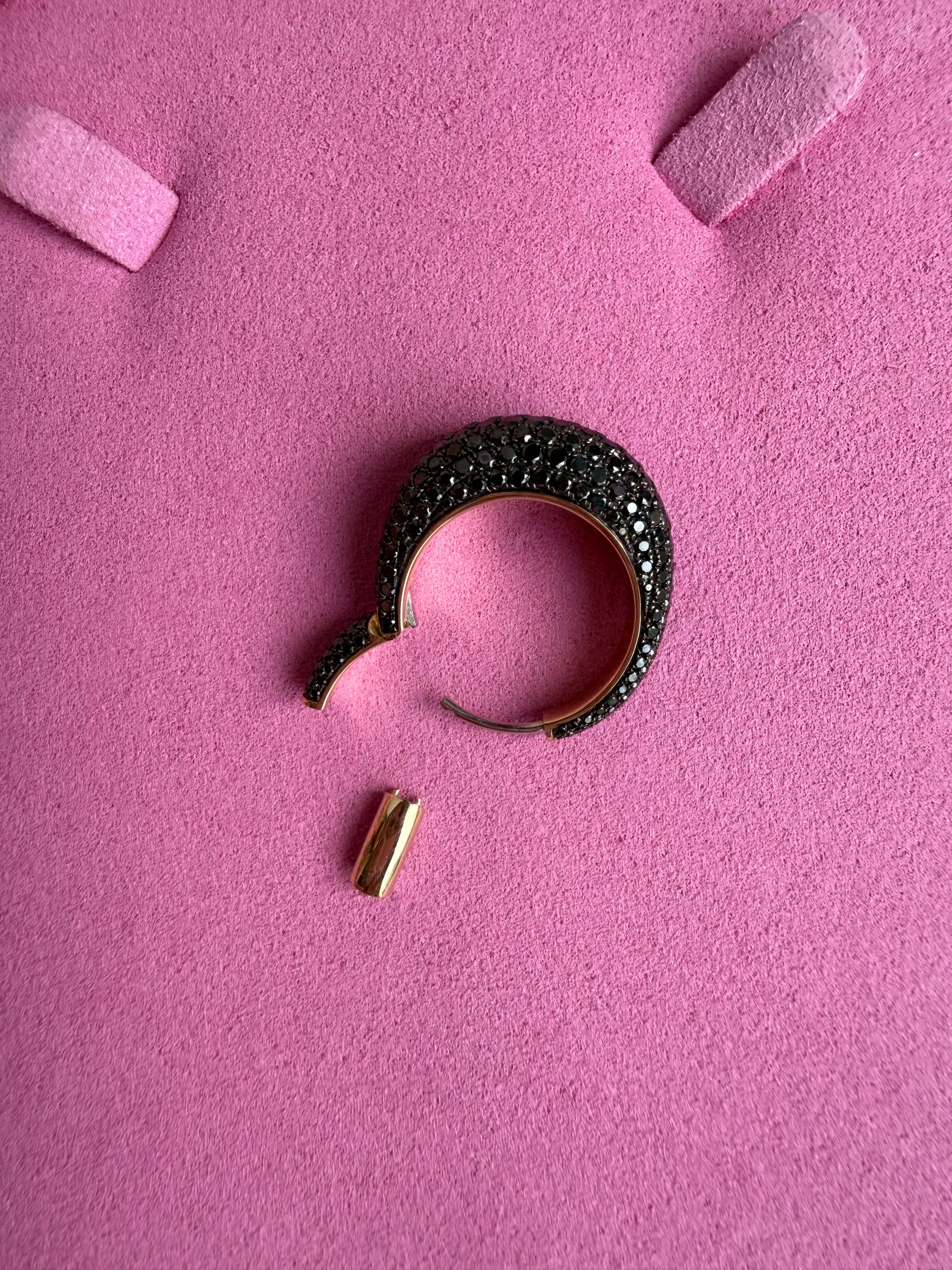 Pieza única, original y multi uso que te hará sentir elegante y cool. Esta pieza se transforma en anillo y aretes de una manera simple y rápida, haciéndola increíble para multiples ocasiones. Una pieza mágica que puedes utilizarla durante toda tu vida elaborada de oro 14k con diamantes naturales negros.