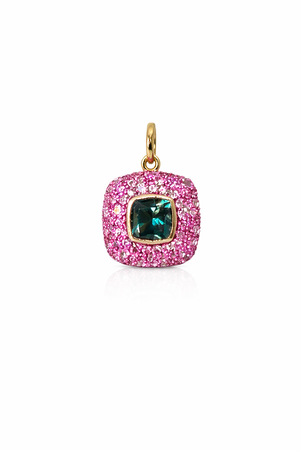 Dije en oro 14k en forma cuadrada con 0.96 ct de zafiro rosa y 1.24 de piedra preciosa conocida como London Blue Topaz, un tono turquesa precioso.